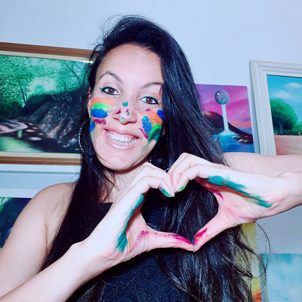 Comecei a ter um conhecimento básico sobre Artistas Plásticos e este mundo da Arte nas aulas de educação artística do ensino fundamental, mas até ai não imaginava o que estava por vir. Com 14 anos, meus pais junto com minha irmã Vanessa (01 ano mais velha do que eu), me levaram em um ateliê de um artista plástico, na cidade vizinha. Onde, para minha surpresa, meus pais me inscreveram no curso de pintura, no qual, foi o meu primeiro contato prático com a pintura de verdade. Lembro-me como se fosse agora: FOI MA-RA-VI-LHO-SO a sensação de desenhar e dar as primeiras pincelas em uma tela até concluir a pintura. Esse momento foi à prova essencial que precisava para ter a certeza de que realmente era tudo que eu queria para minha vida. Ser uma Artista e vivenciar todos os dias essa sensação maravilhosa que a pintura me proporciona – Alegria e faz meu coração Vibrar.
