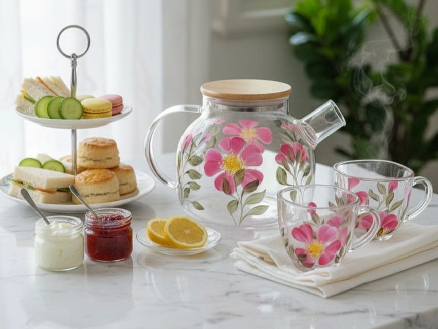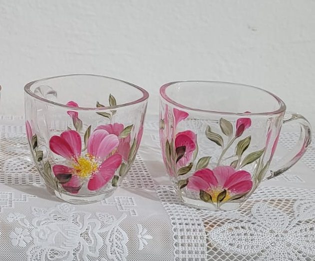 Xícaras de Vidro Pintada à Mão – cheia de Vida com Flores radiantes com nuances rosa e Folhas suaves, para agraciar a Beleza que cabe na palma de sua Mão.