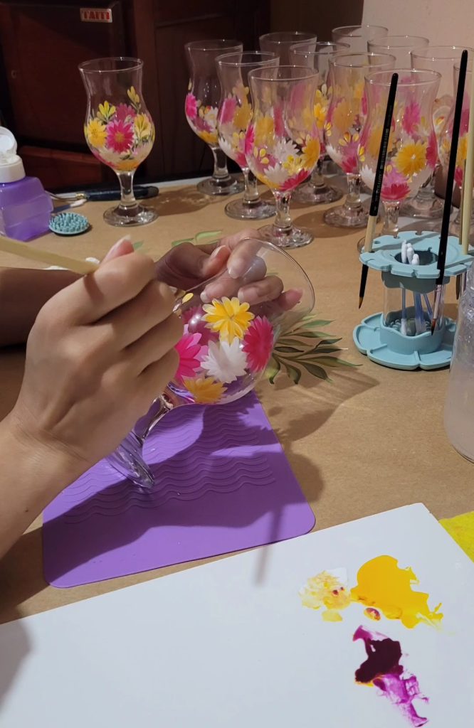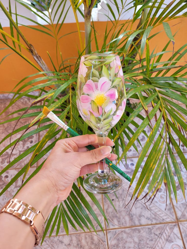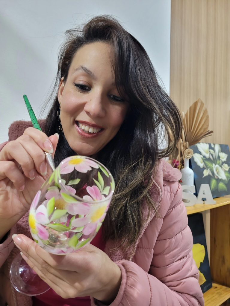 Os participantes aprendem técnicas exclusivas de pintura em vidro e criam suas próprias taças personalizadas — guiados passo a passo com delicadeza e atenção.